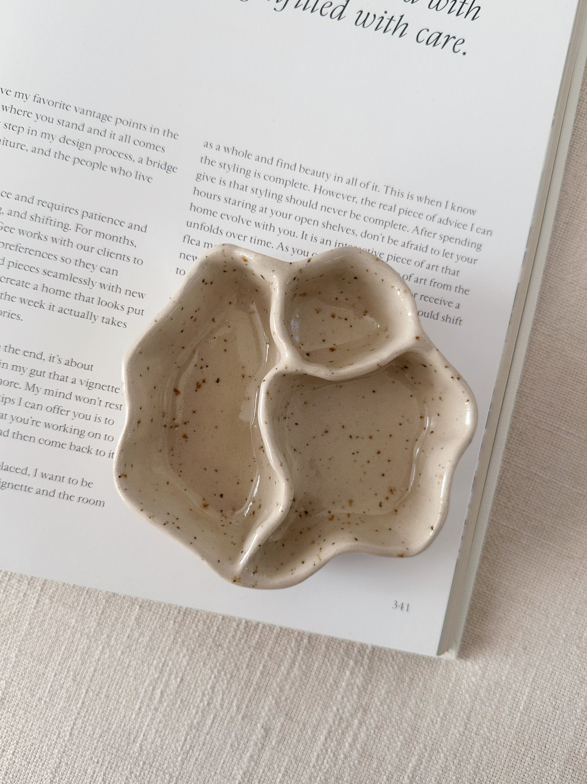 A jewelry dish perfect for storing your jewelry in a decorative way. Made with lava clay. Could also be used to plate smaller snacks such as nuts. Bottom one on the second photo.
